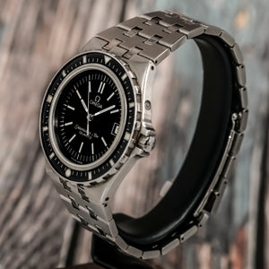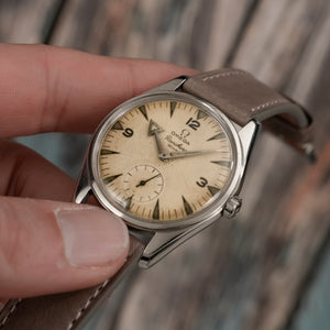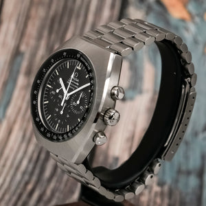 Chronographe de collection 3 compteurs en acier inoxydable Breitling Navitimer Cosmonaute "Scott Carpenter" première génération Réf.809 Cal.Venus 178 modifié (l'aiguille des heures fait un tour de cadran par jour) fonction addition des heures et minutes (30min), mouvement à remontage manuel. Cadran 24h gilt (laqué) "Twin Jet" tritium, 3 lignes : Breitling/Genève/Cosmonaute, chiffres arabes et aiguillage luminescents à l'origine, boitier fond pressé, lunette bidirectionnelle faisant fonction de règle à calcul. Dimensions: 40 mm (hors couronne et poussoirs) x 46 mm (anses inclues), le mécanisme et la boite sont signés et numérotés.